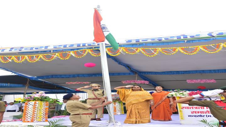 मंदसौर l देश की आजादी की 78 वीं सालगिरह पूरे जिले में हर्षोल्लास व समारोहपूर्वक मनाई गई। इस अवसर पर जिलास्तरीय मुख्य कार्यक्रम प्रधानमंत्री कॉलेज ऑफ एक्सीलेंस राजीव गाँधी शासकीय स्नातकोत्तर महाविद्यालय, क्रीडा परिसर में आयोजित किया गया। इस दौरान जिलास्तरीय स्वतंत्रता दिवस समारोह के मुख्य अतिथि जिले की प्रभारी मंत्री एवं महिला एवं बाल विकास विभाग मध्य प्रदेश शासन की मंत्री सुश्री निर्मला भूरिया ने राष्ट्र ध्वजारोहण किया तथा परेड की सलामी ली। प्रभारी मंत्री ने इस अवसर पर देश की प्रगति के प्रतीक रंग-बिरंगें गुब्बारे भी हवा में मुक्त किये। मुख्यमंत्री म.प्र. शासन का संदेश प्रसारण