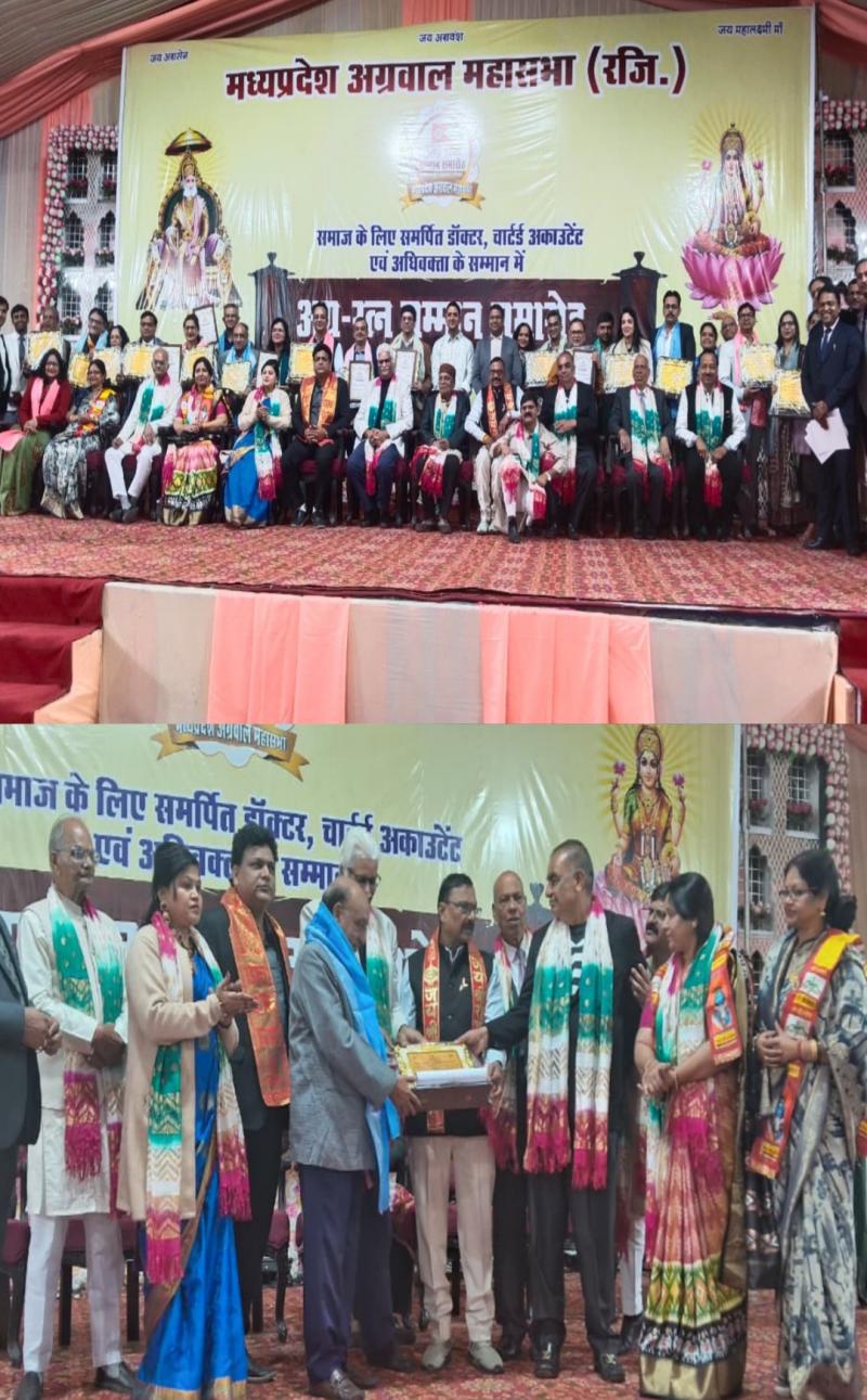 भोपाल। मध्य प्रदेश अग्रवाल महासभा द्वारा राजधानी भोपाल स्थित हिंदी भवन में अग्र रत्न सम्मान समारोह का भव्य आयोजन किया गया। समारोह में चिकित्सा, विधि एवं लेखा के क्षेत्र में उल्लेखनीय योगदान देने वाले 100 से अधिक डॉक्टरों, अधिवक्ताओं एवं चार्टर्ड अकाउंटेंट्स को सम्मानित किया गया।