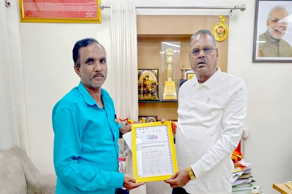 मंत्री श्री कुशवाह से दिव्यांग शतरंज खिलाड़ी श्री वनस्कार ने की सौजन्य भेंट