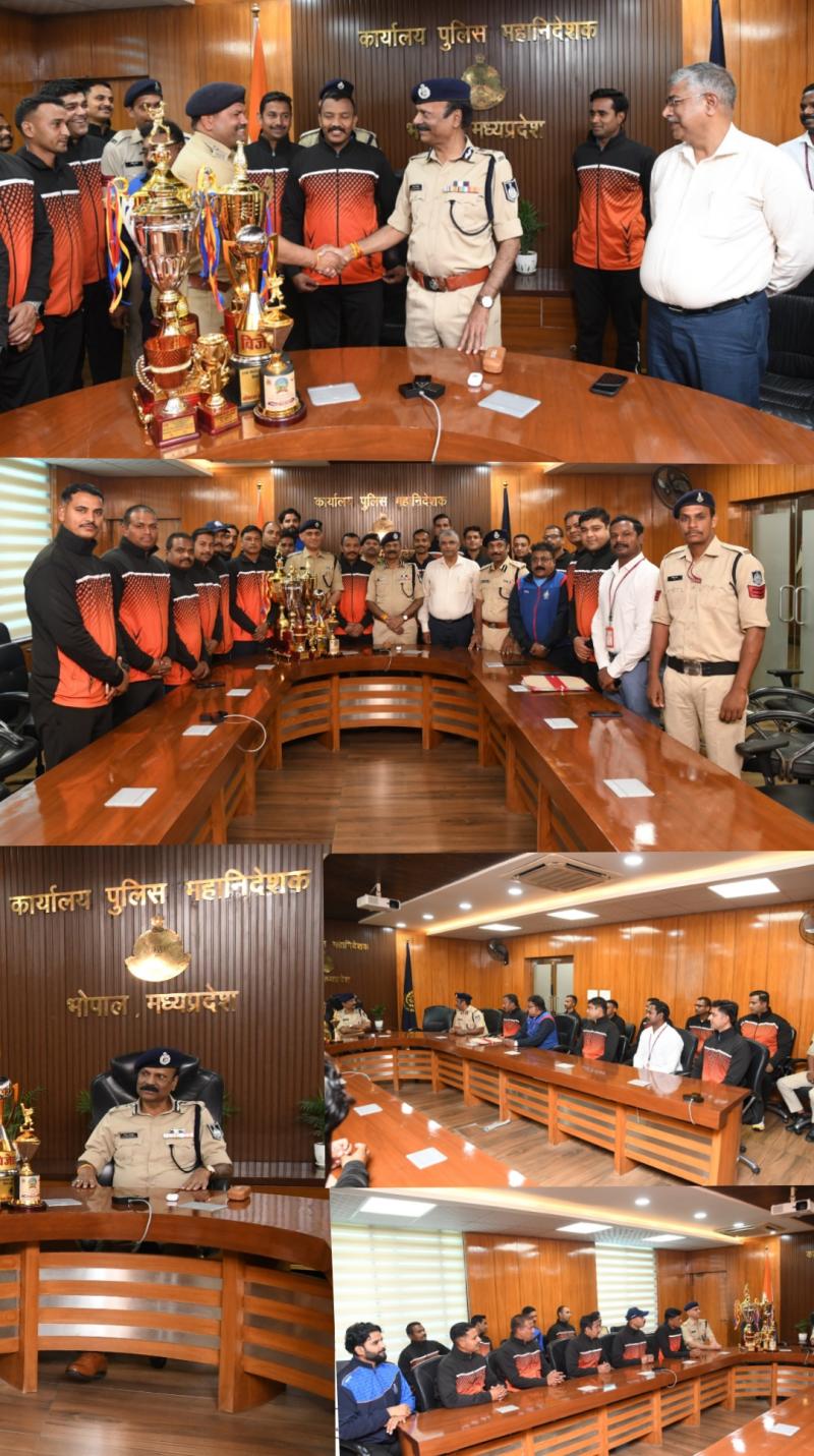 भोपाल। मध्यप्रदेश पुलिस की डीजीपी इलेवन क्रिकेट टीम ने वर्तमान खेल सत्र में उत्कृष्ट प्रदर्शन करते हुए चार प्रमुख क्रिकेट प्रतियोगिताओं में विजेता बनकर उल्लेखनीय उपलब्धि हासिल की है। इस अवसर पर डीजीपी इलेवन टीम के खिलाड़ियों ने पुलिस मुख्यालय में पुलिस महानिदेशक श्री कैलाश मकवाणा से सौजन्य भेंट की।