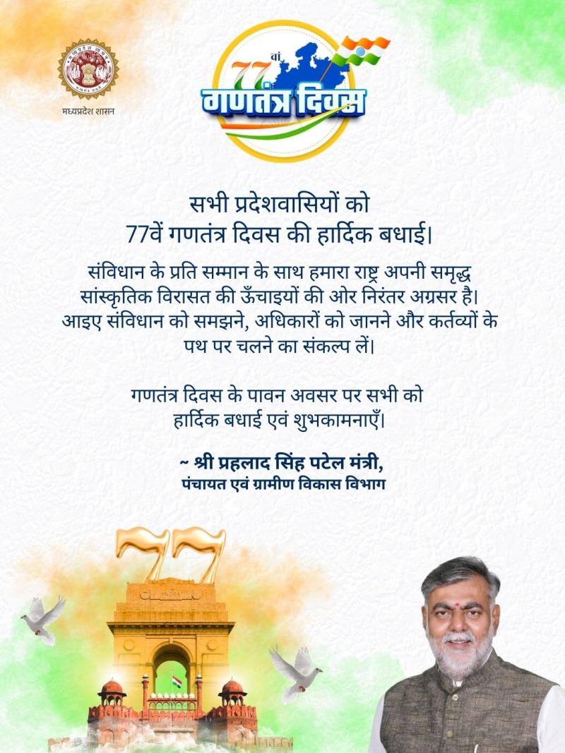 पंचायत मंत्री प्रहलाद सिंह पटेल ने दी राष्ट्रीय पर्व गणतंत्र दिवस की शुभकामनाएं