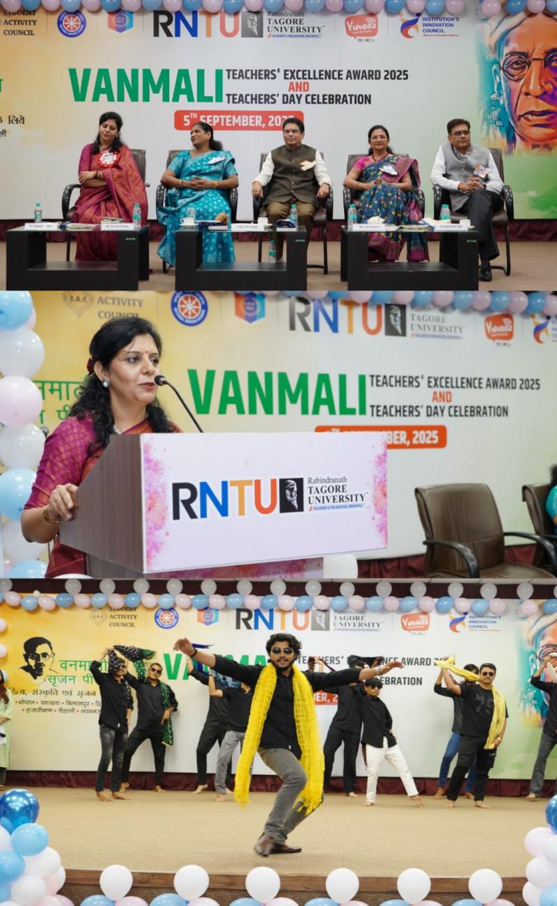 भोपाल। रबीन्द्रनाथ टैगोर विश्वविद्यालय में आज शिक्षक दिवस बड़े उत्साह और गरिमा के साथ मनाया गया। इस अवसर पर विश्वविद्यालय के कुलपति डॉ. रवि प्रकाश दुबे मुख्य अतिथि के रूप में उपस्थित रहे। विशिष्ट अतिथियों में सुश्री टिनी तारे पांडेय (प्रोजेक्ट ऑफिसर, महिला एवं बाल विकास विभाग, म.प्र. शासन) तथा सुश्री ज्योति रात्रे (मोटिवेशनल स्पीकर एवं सबसे अधिक उम्र की भारतीय महिला पर्वतारोही) शामिल रहीं। प्रति-कुलपति डॉ. संजीव कुमार गुप्ता, कुलसचिव डॉ. संगीता जौहरी तथा कार्यक्रम समन्वयक व डीन स्टूडेंट वेलफेयर डॉ. शीतल गुलाटी ने भी विशेष उपस्थिति दर्ज कराई।