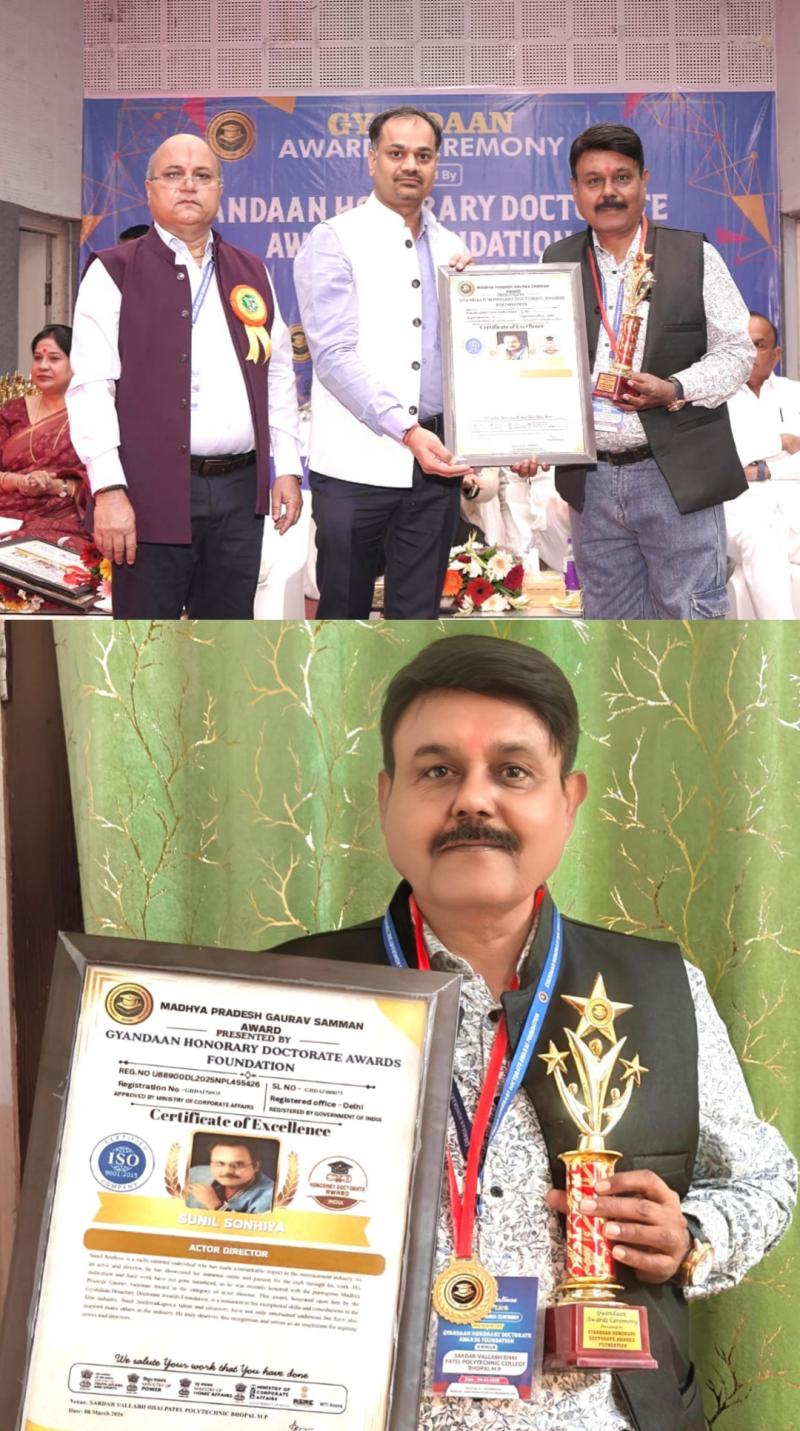 भोपाल। Gyandaan Honorary Doctorate Awards Foundation, Delhi द्वारा आयोजित भव्य सम्मान समारोह में फिल्म एवं रंगमंच के क्षेत्र में अभिनय और निर्देशन में उल्लेखनीय योगदान देने वाले वरिष्ठ रंगकर्मी अभिनेता , निर्देशक सुनील सोन्हिया को “मध्यप्रदेश गौरव सम्मान” से सम्मानित किया गया।