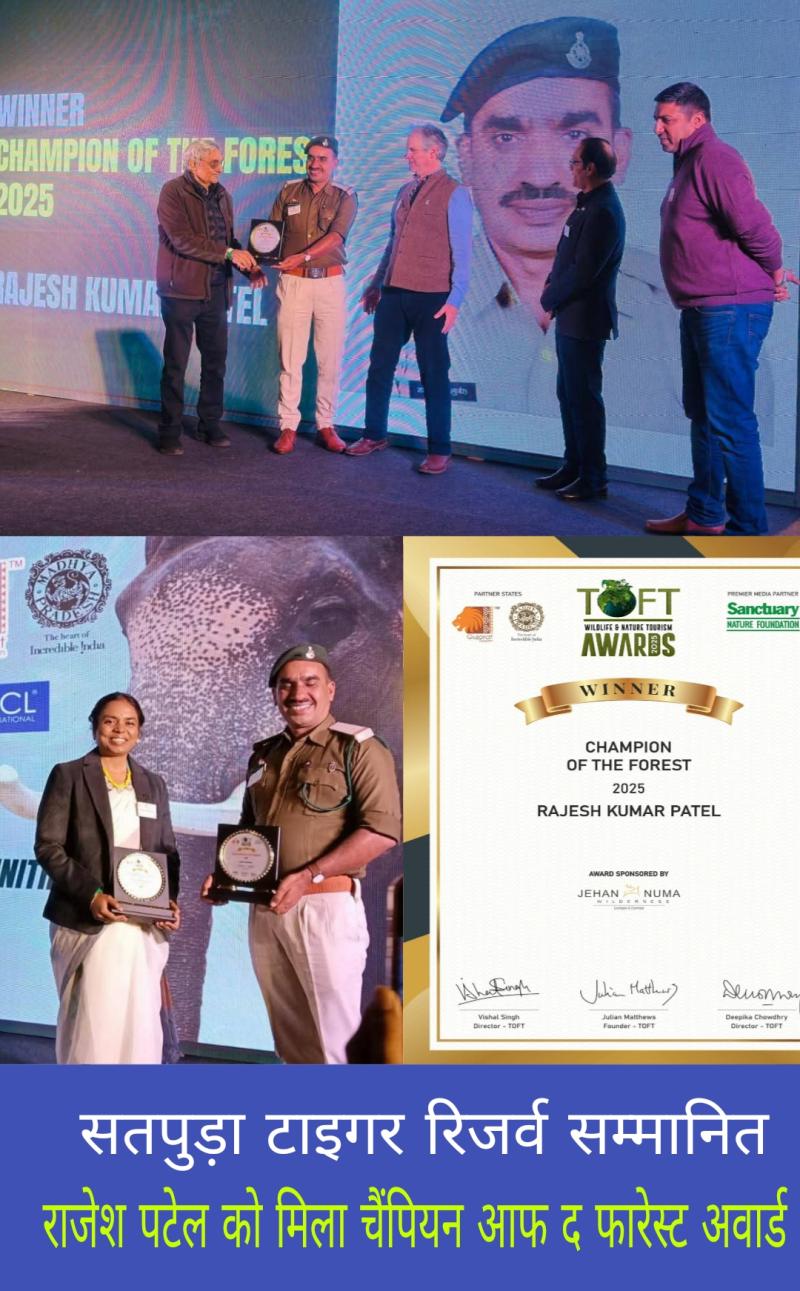 नर्मदापुरम l सतपुड़ा टाइगर रिजर्व को नई दिल्ली में प्रतिष्ठित सम्मान मिला है। सतपुड़ा अभ्यारण्य को 'टीओएफटी (TOFT) कैलाश सांखला पर्यटक-अनुकूल वन्यजीव राष्ट्रीय उद्यान पुरस्कार 2025' से नवाजा गया। यह पुरस्कार एसटीआर की डिप्टी डायरेक्टर ऋषभा नेताम ने ग्रहण किया। इसी कार्यक्रम में पचमढ़ी में पदस्थ वन रक्षक राजेश पटेल को 'चैंपियन ऑफ द फॉरेस्ट' अवॉर्ड दिया गया। पचमढ़ी में पदस्थ वन रक्षक राजेश पटेल को टीओएफटी पुरस्कार समारोह में 'चैंपियन ऑफ द फॉरेस्ट' पुरस्कार से सम्मानित किया गया। यह सम्मान उन्हें वन और वन्यजीवों की रक्षा के प्रति उनकी प्रतिबद्धता के लिए दिया गया है।
