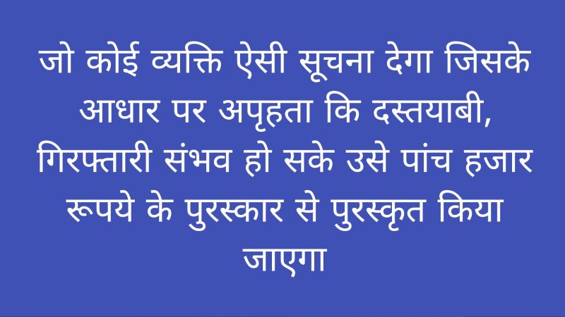 कोई व्यक्ति ऐसी सूचना देगा जिसके आधार पर अपृहता कि दस्तयाबी, गिरफ्तारी संभव हो सके उसे मिलेंगे पांच हजार रूपये