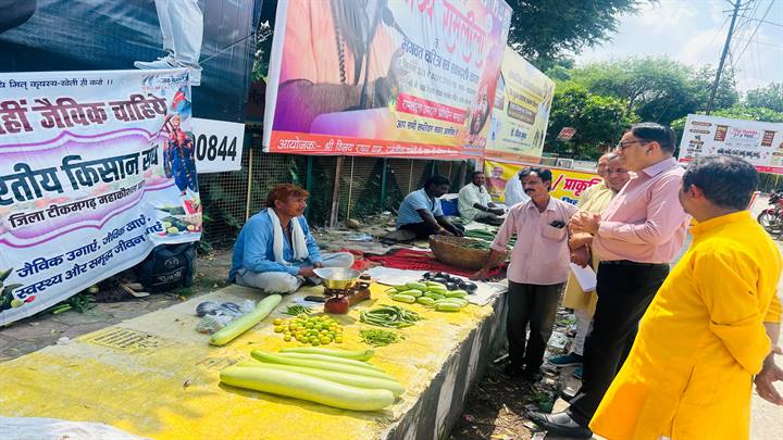टीकमगढ़ कलेक्टर श्री विवेक श्रोत्रिय ने भारतीय किसान संघ के अध्यक्ष श्री शिवमोहन गिरी के साथ आज सर्किट हाउस के पास लगने वाले जैविक हाट बाजार निरीक्षण किया एवं जैविक खेती कर सब्जियां उगाने वाले किसानों से बातचीत की। कलेक्टर श्री विवेक श्रोत्रिय ने उपसंचालक कृषि विभाग को सभी जैविक खेती करने वाले किसानों को उन्नत प्रशिक्षण देने एवं उनका प्रमाणीकरण करने के निर्देश दिए।