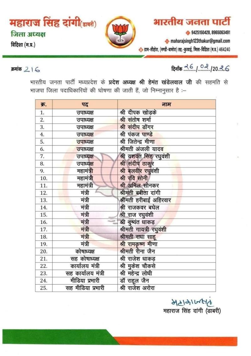 भोपाल l विदिशा जिले की भाजपा की जिला कार्यकारिणी की घोषणा हो गई है l देखिए पूरी सूची...
