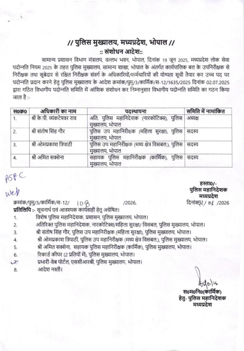 भोपाल l पुलिस विभाग में पदोन्नति समिति का गठन किया गया है l जिसके अध्यक्ष एडीजी के पी वेंकटेश्वर राव बनाए गए हैं तथा तीन सदस्य बनाए गए हैं l