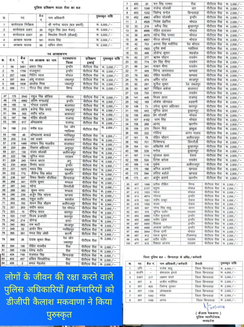 अतः उक्त अच्छे कार्य हेतु निम्नालिखित अधिकारियों / कर्मचारियों को डीजीपी कैलाश मकवाणा द्वारा उत्साहवर्धन हेतु नाम के समक्ष दर्शाये अनुसार नगद राशि से पुरूस्कृत किया गया है l