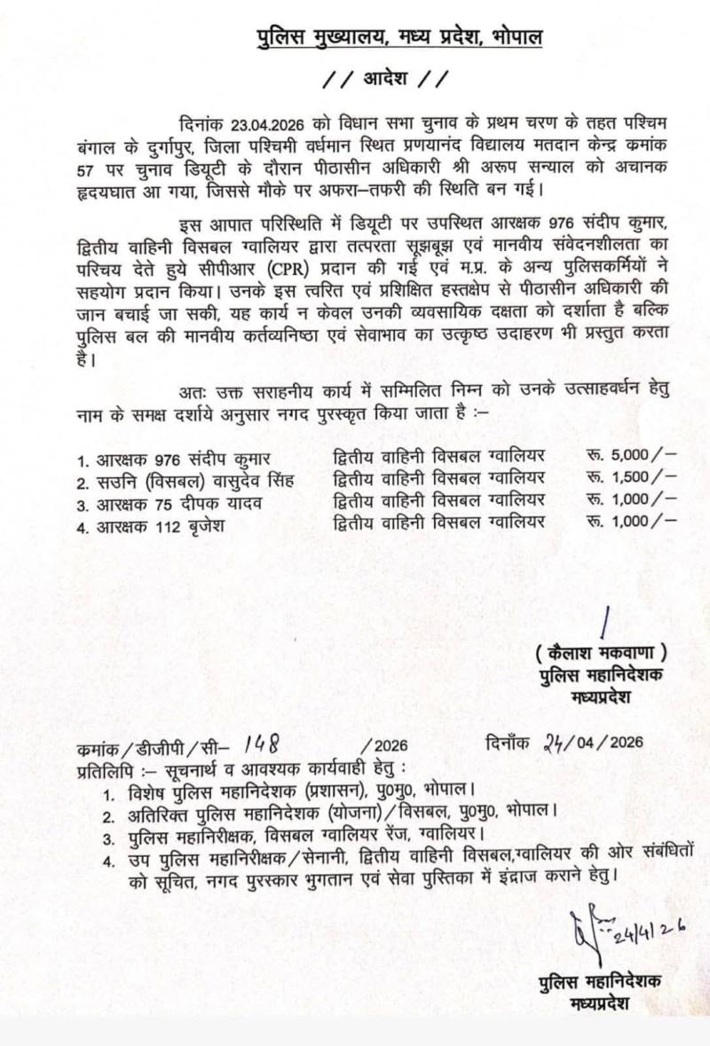 भोपाल l मध्यप्रदेश पुलिस के पुलिसकर्मियों द्वारा पश्चिम बंगाल में विधानसभा चुनाव के प्रथम चरण के अंतर्गत मतदान प्रक्रिया के बीच पीठासीन अधिकारी श्री अरूप सान्याल को अचानक हृदयाघात (हार्ट अटैक) आ गया, जिससे वे अचेत हो गए और मतदान केंद्र पर कुछ समय के लिए तनावपूर्ण स्थिति निर्मित हो गई। ऐसे संवेदनशील समय में वहां तैनात मध्यप्रदेश पुलिस की द्वितीय बटालियन, विशेष सशस्त्र बल (SAF), ग्वालियर के पुलिसकर्मियों ने अत्यंत तत्परता एवं सूझबूझ का परिचय देते हुए तत्काल स्थिति को नियंत्रित किया।