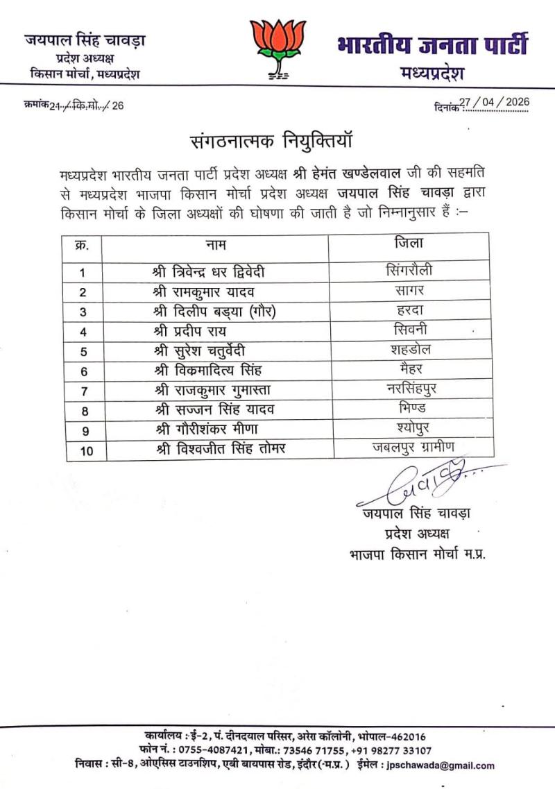 भोपाल l भारतीय जनता पार्टी के प्रदेश अध्यक्ष व विधायक श्री हेमंत खण्डेलवाल जी की सहमति से भाजपा किसान मोर्चा के प्रदेश अध्यक्ष श्री जयपाल सिंह चावड़ा द्वारा मोर्चा के जिला अध्यक्षों की घोषणा की जाती है, जो उपरोक्तानुसार है ...