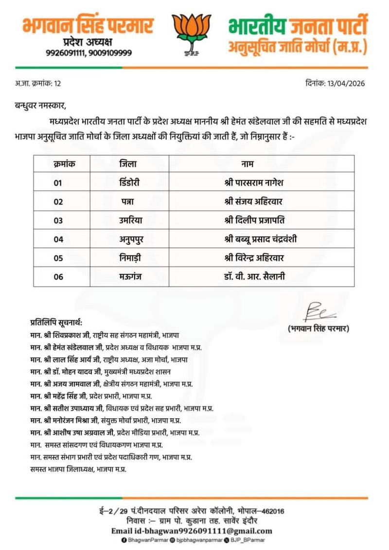 भोपाल। भाजपा अनुसूचित जाति मोर्चे में आज 5 जिलों में जिला अध्यक्षों की नियुक्ति की गई है सूची उपरोक्त अनुसार है