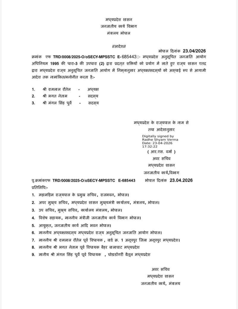 भोपाल। मध्य प्रदेश सरकार ने आज अनुसूचित जनजाति आयोग में अध्यक्ष और सदस्यों के नाम की नियुक्ति कर दी है l